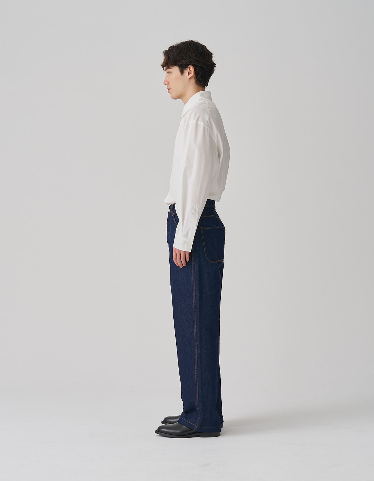 A wide silhouette with a straight, architectural fall. Designed to sit clean at the waist and drape with quiet volume through the leg.