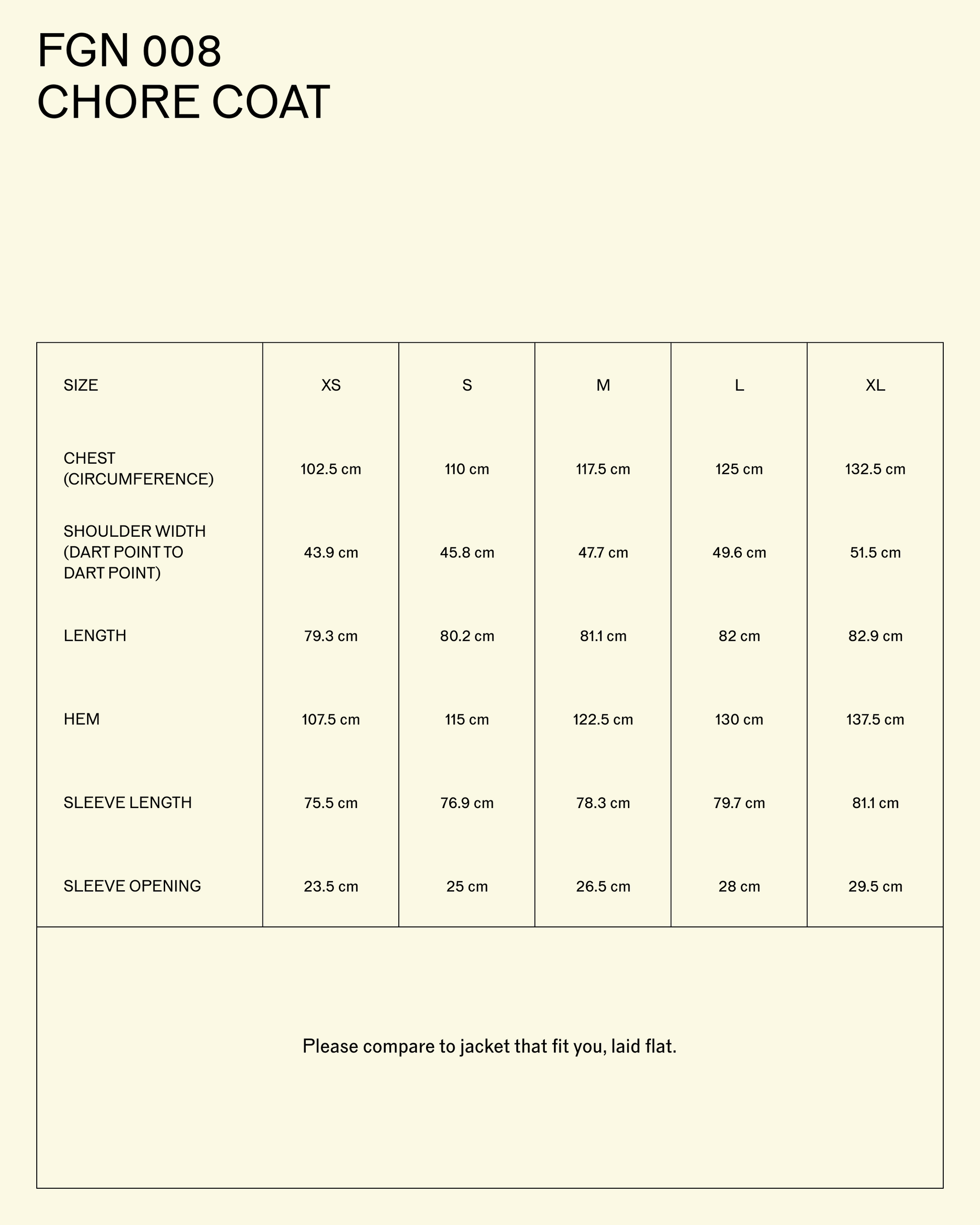 A relaxed cotton chore coat, with a washed finish. Built from 100% cotton and designed to layer over a shirt/t-shirt, the FGN 008 balances utility and a clean, rounded silhouette. The result is a modern Japanese interpretation of work coats.