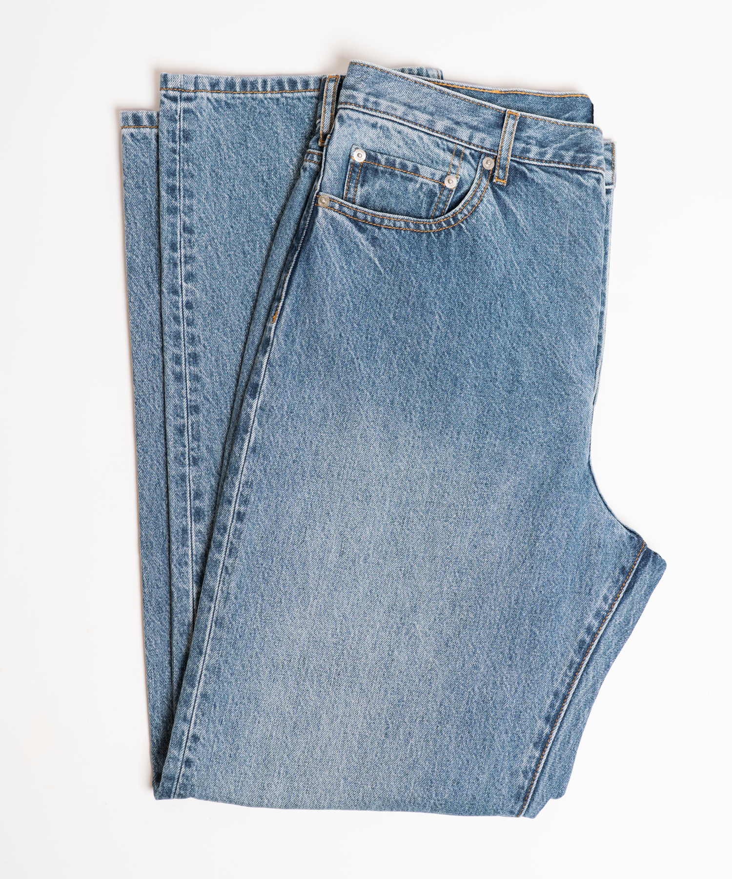 Our Japanese 'dad' jeans. The idea was to create an easy ('raku' in Japanese) daily driver that wouldn't require too much thought or self consciousness. We chose a 13.25oz Japanese denim from Kaihara Mills in Japan, which would be suitable for four seasons in most climates. It's then cut/sewn with our factory partners in Shenzhen. This is a straight leg, comfortable cut.