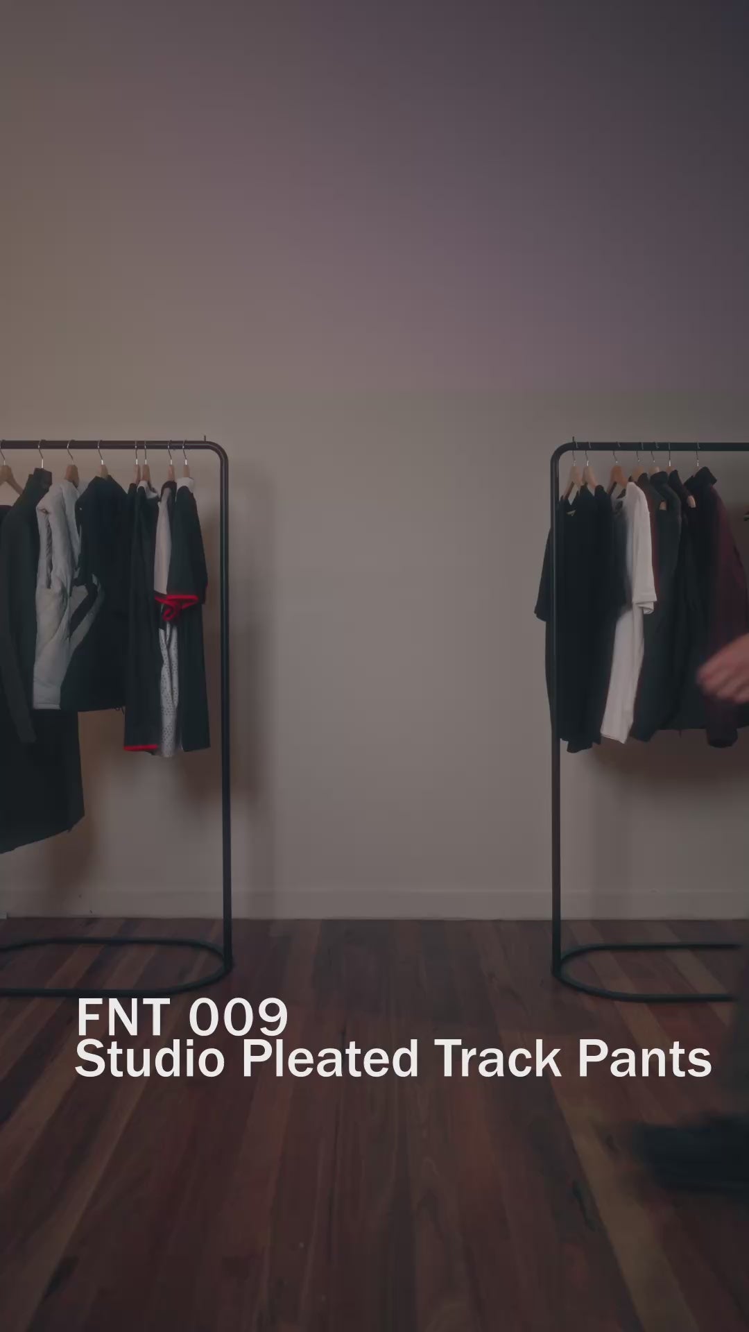 The idea was to create a sophisticated track pant. 100% polyester fabric and heavy drawstring with weighted aglets. A symmetrical side pleat gives comfort and volume in the leg.