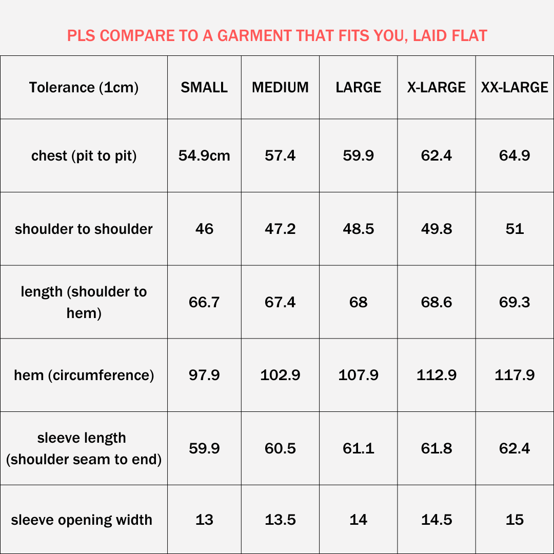 Please refer to a garment that fits you and compare it to the provided size chart.